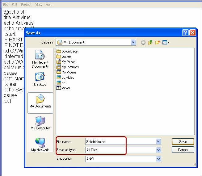 - Now save your file with safetricks.bat and select “All files”.